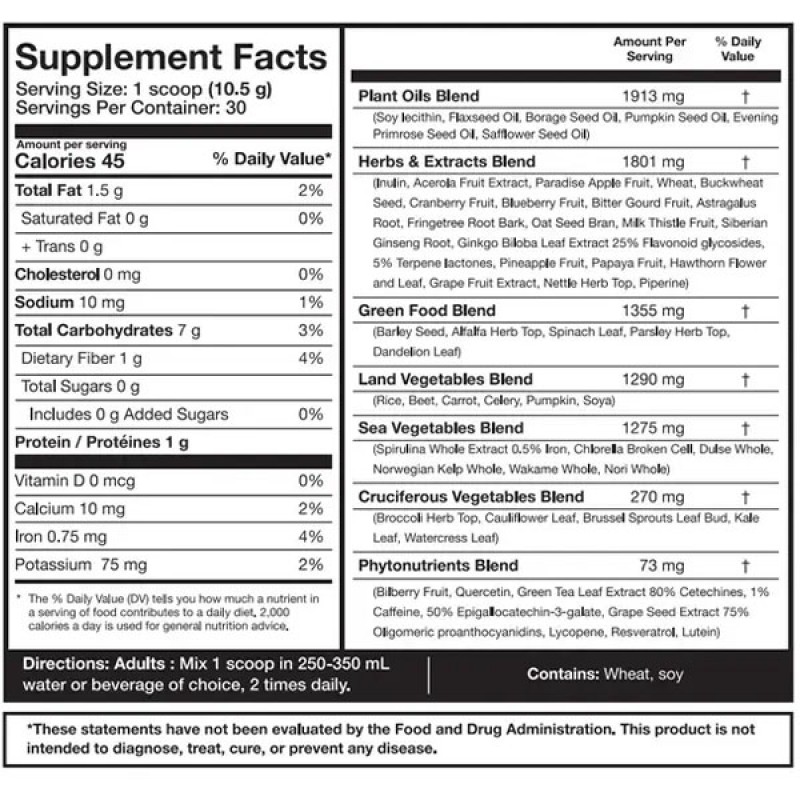 Каждая порция, богатая антиоксидантами, может помочь нейтрализовать разрушительное действие свободных радикалов, а также обеспечить подлуговую смесь, которая помогает организму восстановить оптимальный кислотно-щелочной баланс. Добавление красных морских водорослей, которые очень богаты минералами, способствуют подщелачиванию смеси. Исследования показывают, что изолированные растения никогда не могут заменить синергетический эффект, который существует во всех растениях. Смесь суперпродуктов обеспечивает полезные свойства цельных продуктов, а не только отдельные химические вещества растений, выращенных в лаборатории. Компания тщательно разрабатывает формулу небольшими партиями, чтобы гарантировать, что каждый ингредиент сохраняет свою чистоту и эффективность.