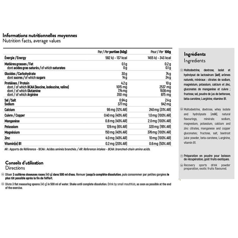 Рекомендации по применению: Разведите 3 мерные ложки без горки (40 г) в 500 мл воды. Размешайте до полного растворения, выпейте маленькими глотками непосредственно после окончания тренировки.