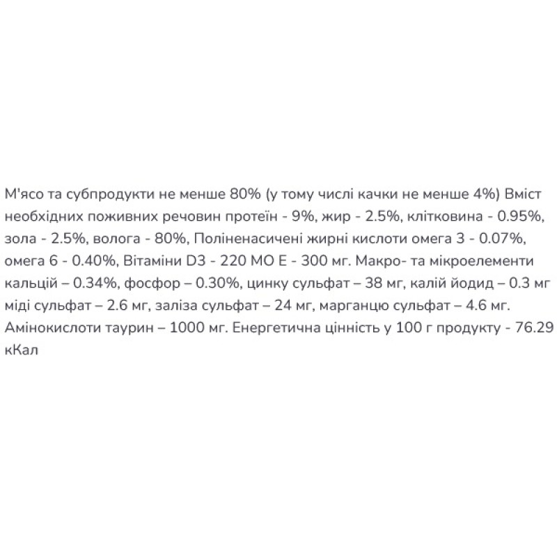 Сочные кусочки утки обеспечивают кота высококачественным легкоусвояемым протеином. Влажный корм ТМ Carpathian Pet Food содержит 80% белков животного происхождения. Повышенное содержание витаминов (A, D3, E) и минералов (йод, железо, марганец) значительно укрепляет иммунитет кошки. Omega 3, Omega 6 и цинк имеют позитивное влияние на кожу и шерсть животного. Содержимое Таурина способствует нормальному пищеварению, улучшает зрение, нормализует работу сердечной мышцы.