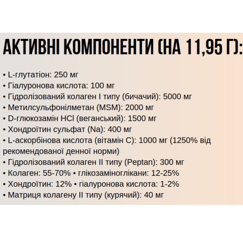 - Коллаген типа I (гидролизованный): способствует поддержанию и восстановлению структуры кожи, связок, сухожилий и костей.