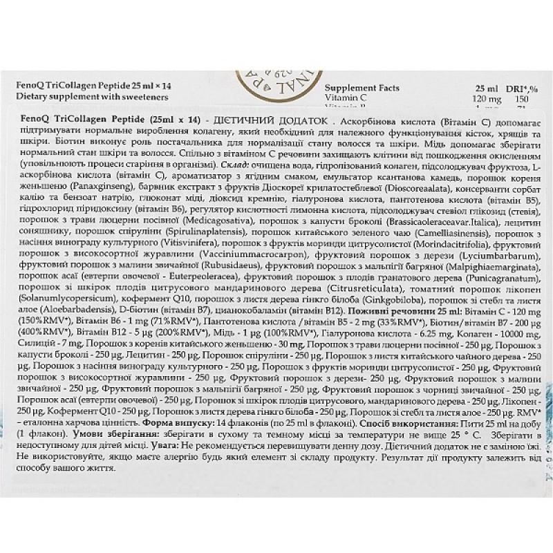 FenoQ TriCollagen Peptide - 14 коллагеновых коктейлей, которые содержат 3 основных компоненты, - гидролизованный рыбий коллаген (1 и 3 типа), гиалуроновую кислоту, а также комплекс витаминов, микроэлементов, антиоксидантов и биологически-активных ингредиентов растительного происхождения. Продукт рекомендован всем после 25 лет для сохранения молодости кожи, а также профилактики заболеваний опорно-двигательного аппарата. Употребление TriCollagen Peptide способствует увлажнению кожи, сохранению ее эластичности и упругости, разглаживанию первых морщин.