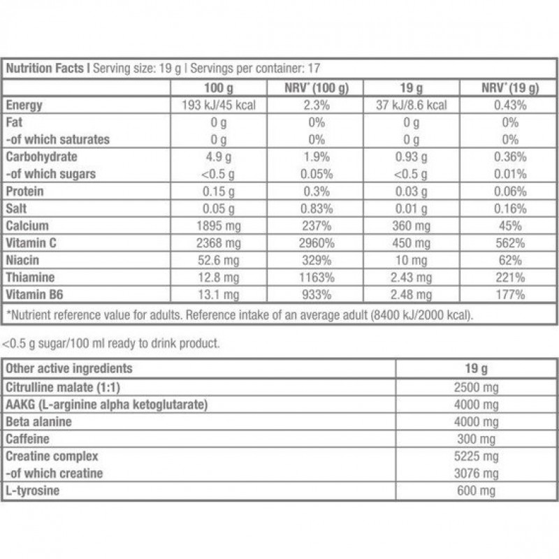 Black Blood NOX+ – комплексный препарат с высоким содержанием кофеина, а добавление креатина повышает физическую выносливость при выполнении кратковременных упражнений высокой интенсивности. Ниацин и витамин В6 участвуют в метаболических процессах высвобождения энергии, а в сочетании с кальцием снижают утомляемость и усталость. Витамин B6 способствует нормальному метаболизму белка и гликогена, а кальций необходим для нормальной работы мышц.