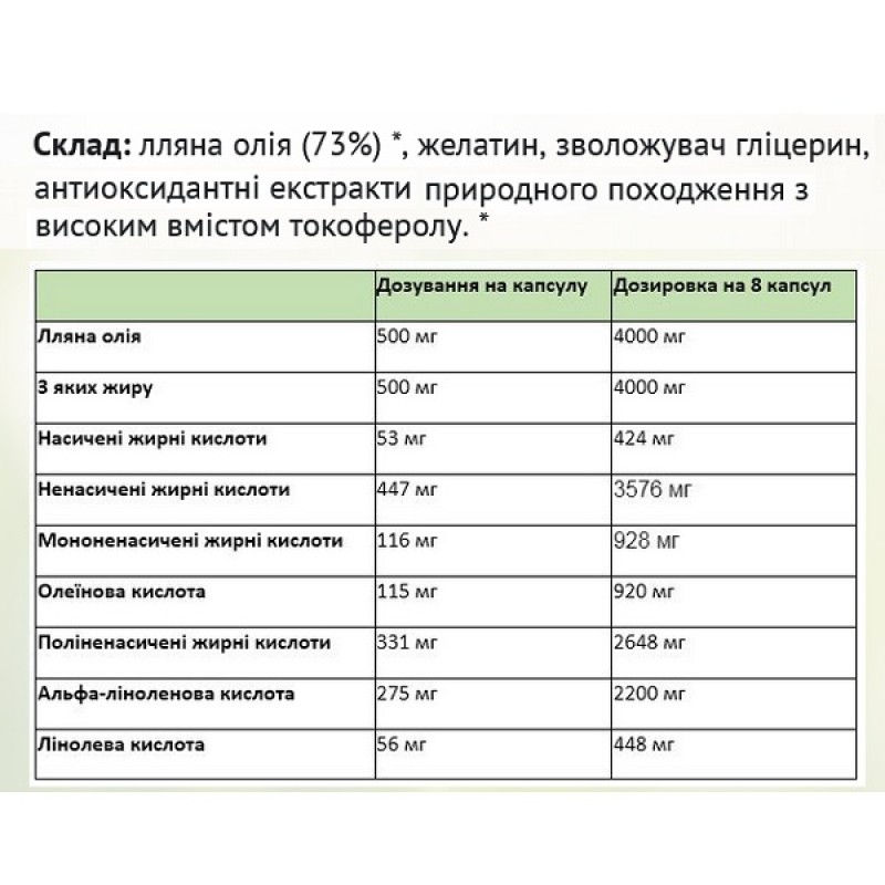 Комплекс Oмега 3-6-9 - это незаменимые полиненасыщенные жирные кислоты, которые проявляют мощным антиоксидантным действием, предотвращают перекисное оксилення липидов. Получено из льняного масла.