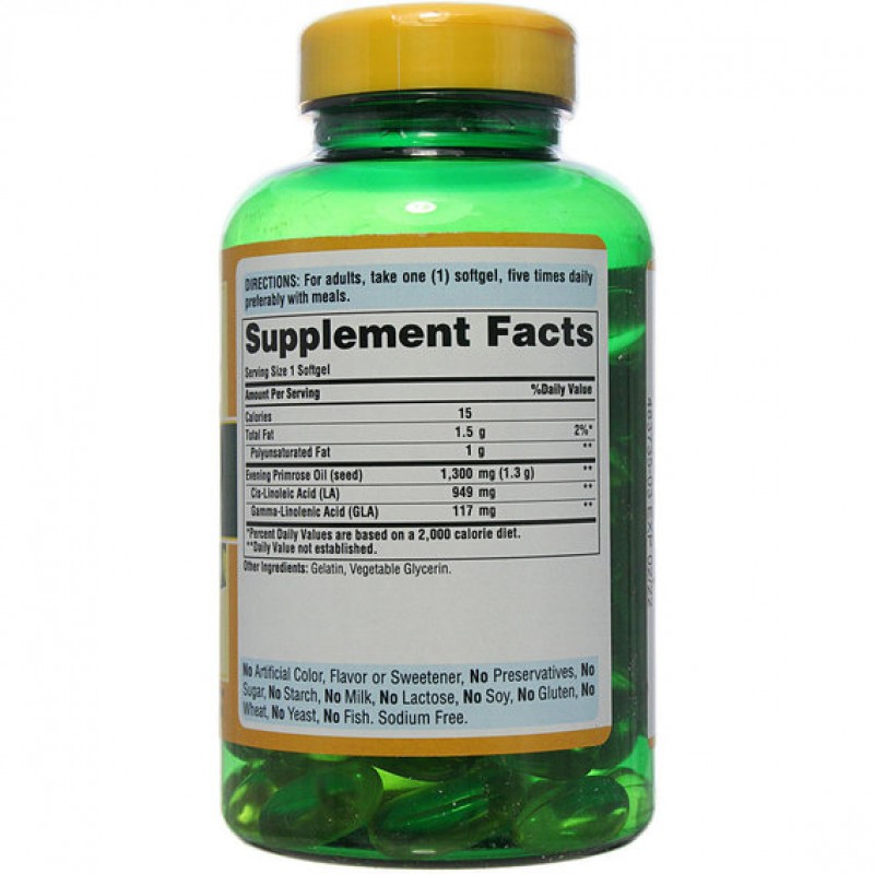 1300 мг масла примулы вечерней в 1 капсуле, 117 мг гамма-линоленовой кислоты (GLA) и 949 мг цис-линолевая кислота (LA)