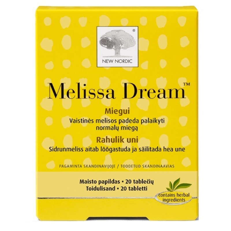 Мелисса лекарственная, лат. Melissa officinalis, уже веками особенно полюбилась гомеопатам. Ее даже называют мелиссой сновидений. «Melissa Dream» – это обоснованная научно формула лекарственных трав, созданная для того, чтобы мы нормально высыпались и просыпались бодрыми. В ней не содержится веществ, вызывающих сонливость. Кроме мелиссы лекарственной, в состав таблеток входит помогающий расслабиться L-теанин, выделенный из экстракта зеленого чая, и витамины B1, B2, B3, B6, B12, поддерживающие нормальную деятельность нервной системы. Кроме того, в таблетках «Melissa Dream» содержится много магния, необходимого для поддержания нормальной деятельности нервной системы и нормальной мышечной функции (при недостатке магния в организме, могут возникнуть спазмы мышц, особенно по ночам).Важным также является разнообразное сбалансированное питание и здоровый образ жизни.