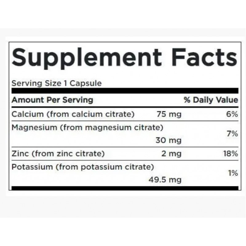 Минералы бывают разных форм, некоторые из них более биодоступны, чем другие. Диетологи обычно считают цитратные формы одними из самых эффективных для пищевых добавок. Вот почему мы создали эту специальную формулу, содержащую 4 основных минерала - кальций, магний, цинк и калий в форме цитрата с высокой абсорбцией.