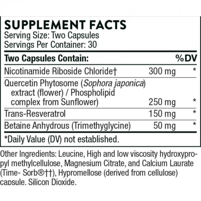 ResveraCel поддерживает здоровое старение несколькими способами. Никотинамид рибозид (NR) поддерживает множественные функции клеточных митохондрий, помогая регулировать клеточное старение и обеспечивая положительную поддержку метаболического синдрома. Ресвератрол имитирует эффект ограничения калорий, активируя группу протеинов сиртуина и продемонстрировал многообещающие результаты в клинических исследованиях, ослабляя эффекты некоторых возрастных состояний. Фитосома кверцетина также повышает активность сиртуина - исследования показывают, что он замедляет расщепление резвератрола в организме. Бетаин обеспечивает превосходную поддержку метилирования, важнейшего органа процесс, который способствует здоровью сердца, сосудов, мозга, нервной системы и печени.