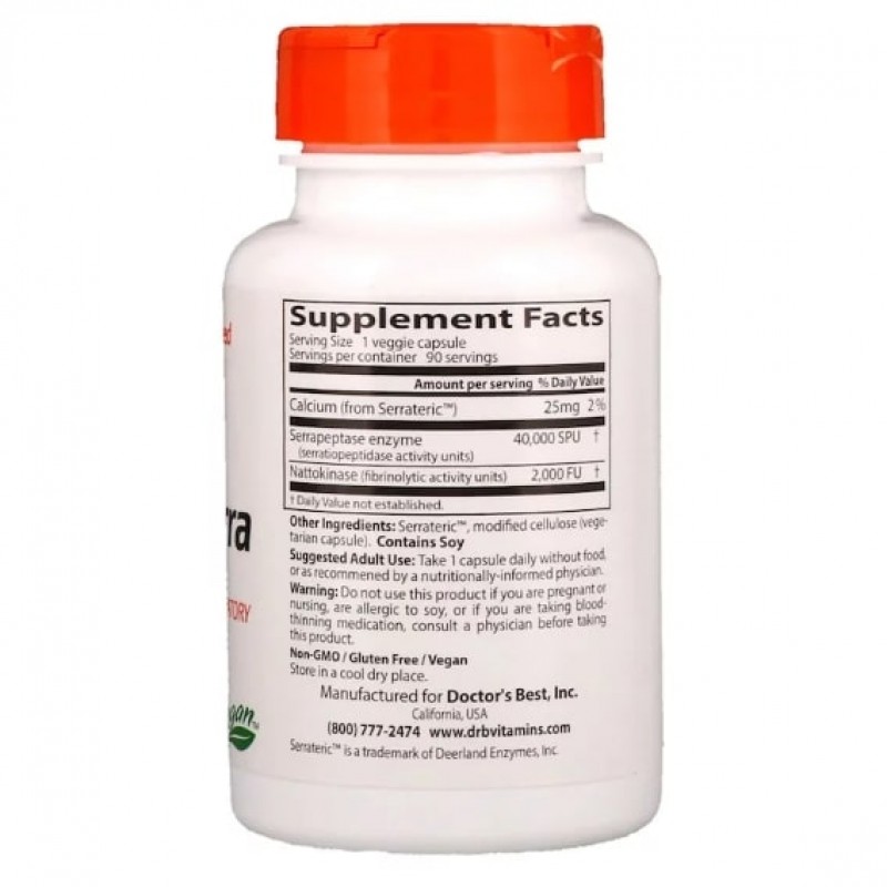 Natto-Serra от Doctor’s Best - это комбинация двух натуральных энзимов, которые не одно десятилетие используются в пищевых добавках. Серрапептаза (серратио-пептидаза) - это перерабатывающий протеины энзим, выделенный из дружественной бактерии Serratia E-15, обнаруженной на японском шелковичном черве. Наттокиназа также расщепляет протеин и добывается из “натто”, ферментированного соевого продукта, который употребляют в пищу жители Японии уже не одно столетие. Эта натокиназа не содержит витамин K. Серрапептаза содержит Serrateric, который является альтернативой кишечнорастворимому покрытию и лучше защищает энзимы, пока они не достигнут кишечника, обеспечивая оптимальное усвоение.