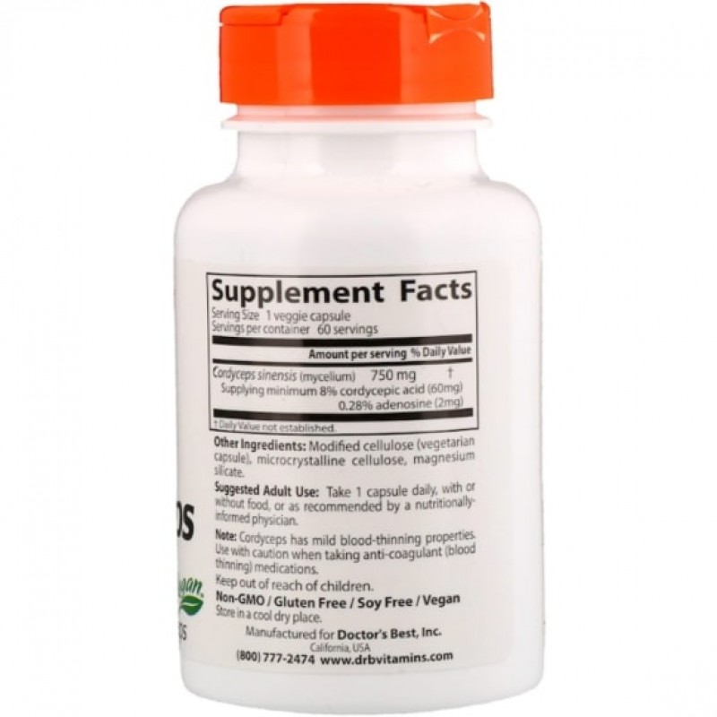 Doctor's Best Ultra Cordyceps содержит чистый культивированный кордицепс китайский – траву, используемую на протяжении веков в Китае как омолаживающий тоник, который придает энергию и поддерживает функции различных органов и систем. Штаммы кордицепса в этом продукте признаны китайским правительством похожими кордицепс китайский (Cordyceps sinensis) – редкий гриб, произрастающий на высоте 15 000 футов в Тибетском нагорье Китая.