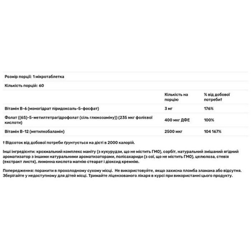 Витамины B-6 B-12 и метилфолат (B-6 B-12 methyl folate) быстро тают во рту и оптимально усваиваются в организме. Эти коэнзимные витамины группы B являются их биологически активными формами. Предназначены для синергической работы, обеспечивая питательную поддержку здоровой сердечно-сосудистой функции посредством синтеза эритроцитов, а также поддерживая обмен белков и нормальный уровень гомоцистеина.