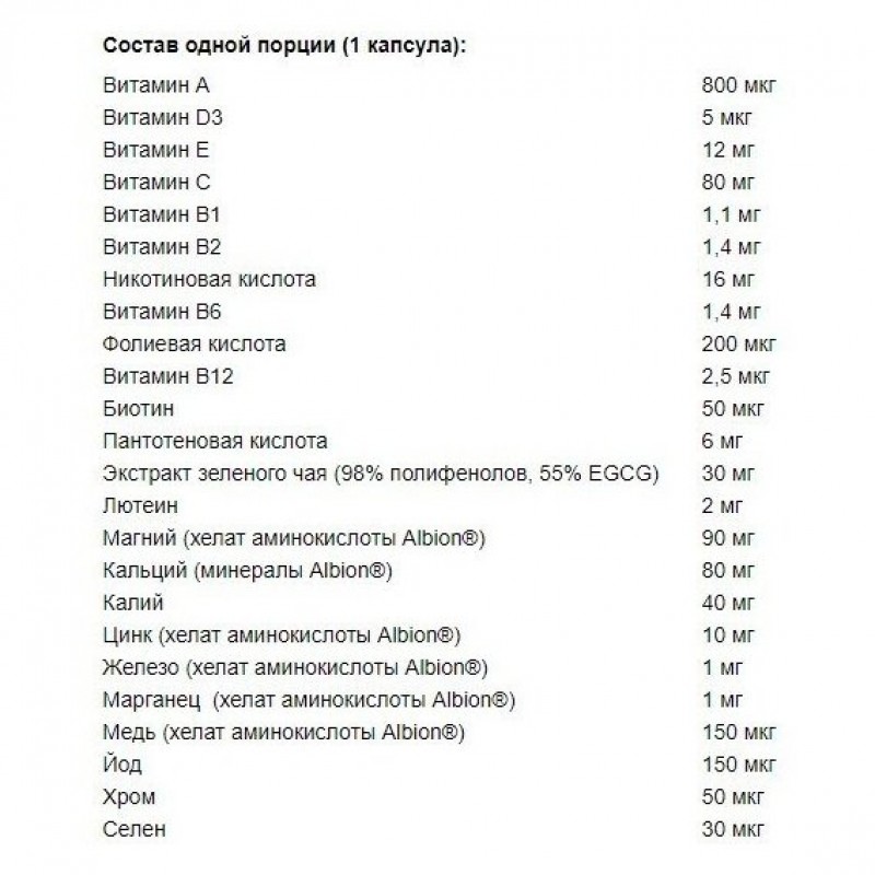 Vita-min Plus - это комплексная композиция витаминов и легкоусваиваемых минералов в виде хелатов (комплексы ионов металлов с аминокислотами для которых характерна высокая растворимость и лучшее усвоение), которые удовлетворяют потребности организма в столь агрессивной экологической среде. Пищевая добавка, обогащенная специально экстрактом Лютеина, необходимого для сохранения и восстановления хорошего зрения, и Гинко Билоба для умственной работы и поддержки нервной системы. Витамины и Минералы - это микроскопические химические вещества, которые берут участие во всех жизненно необходимых процессах, происходящих в организме человека. К сожаленью, единственный источник их поступления - это пища, ведь, как известно, они не могут синтезироваться в организме самостоятельно. Современный способ жизни (нерациональное питание, чрезмерное употребление еды быстрого приготовления, неправильный способ приготовления пищи) не дает возможности получить необходимое количество этих веществ. Еще и дополнительные их потери в организме происходят из-за постоянного стресса, умственных нагрузок, употребления лекарств, вредных привычек и загрязнения окружающей среды. И, как результат, это все отображается на нашем психическом состоянии: ухудшение самочувствия, состояние здоровья и, конечно, не желательные изменения во внешнем виде. Одна капсула Vita-min + покрывает 100 % рекомендуемых норм по некоторым витаминам, а также обогащает большим количеством минеральных компонентов в виде хелатов, особенно цинка, магния и йода (так необходимого в условиях повышенного радиационного загрязнения). Vita-min + - отличается лучшим усвоением минералов и присутствия повышенного количества Лютеина и Гинко Билоба. Олимп Витамин Плюс направлен на ежедневное и регулярное потребление для все людей, не зависимо от уровня физических нагрузок.