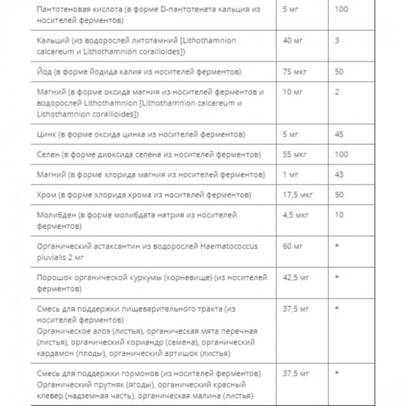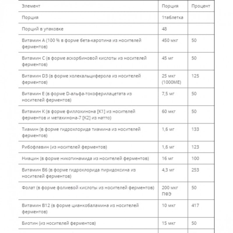 Носитель ферментов (органическая соевая мука, органический Saccharomyces cerevisiae, органический порошок апельсиновой кожуры, органический порошок моркови, органический порошок люцерны, молочнокислые бактерии [Lactobacillus acidophilus, Bifidobacterium bifidum и Lactobacillus rhamnosus], папаин [деактивированный] и бромелаин [деактивированный]), органическая аравийская камедь, диоксид кремния, лаковая смола, карнаубский воск.