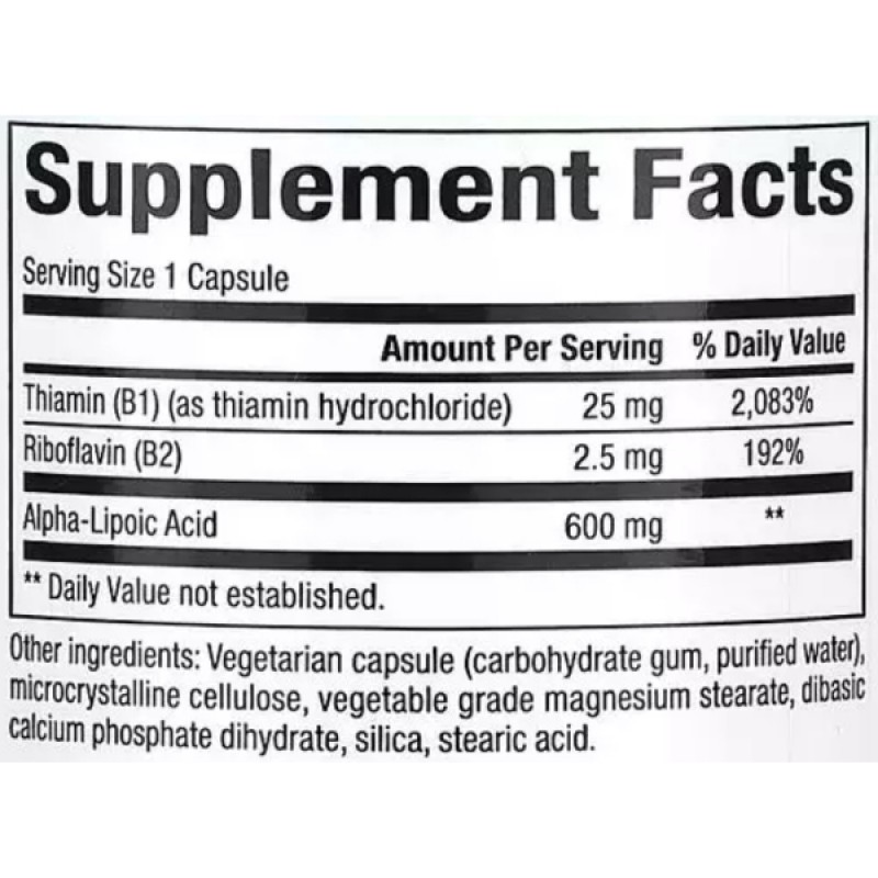 Основная роль альфа-липоевой кислоты – это устранение действия свободных радикалов, которые присутствуют во всем организме. Именно они являются причинами многих заболеваний нервной системы, а также таких болезней, как Альцгеймер. Альфа-липоевая кислота усиливает свое антиоксидантное действие еще и тем, что усиливает свойства витамина С и Е. Это способствует образованию в клетках организма глутатиона – важного кофермента иммунной системы. Для поддержания здорового обмена веществ и усиления роли Альфа-липоевой кислоты, в формулу были добавлены витамины группы B - тиамин (B1) и рибофлавин (B2).