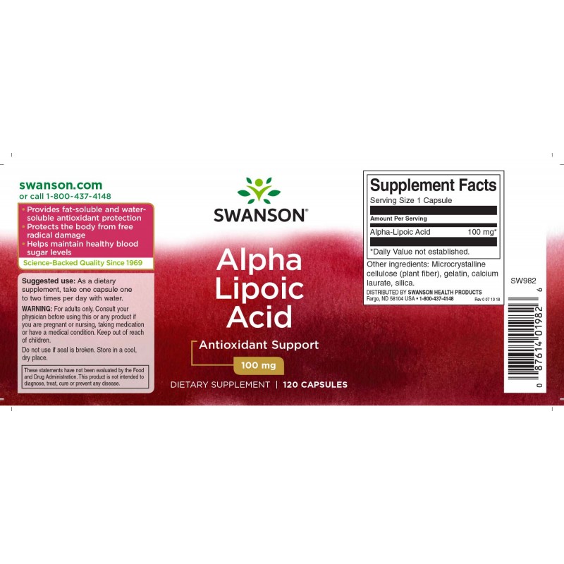 Пищевая добавка Swanson - Alpha Lipoic Acid способствует увеличению антиоксидантной защиты с помощью альфа-липоевой кислоты. Добавка нейтрализует как водорастворимые, так и жирорастворимые свободные радикалы, альфа-липоевая кислота также помогает утилизировать другие антиоксиданты, такие как витамины С и Е, расширяя их полезные свойства в организме.