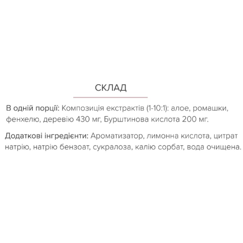Алоэ вера имеет успокаивающее и противовоспалительное действие, поддерживает работу ЖКТ. Ромашка обладает расслабляющими и антисептическими свойствами. Фенхель стимулирует пищеварение, борется с метеоризмом и спазмами. Тысячелистник стимул