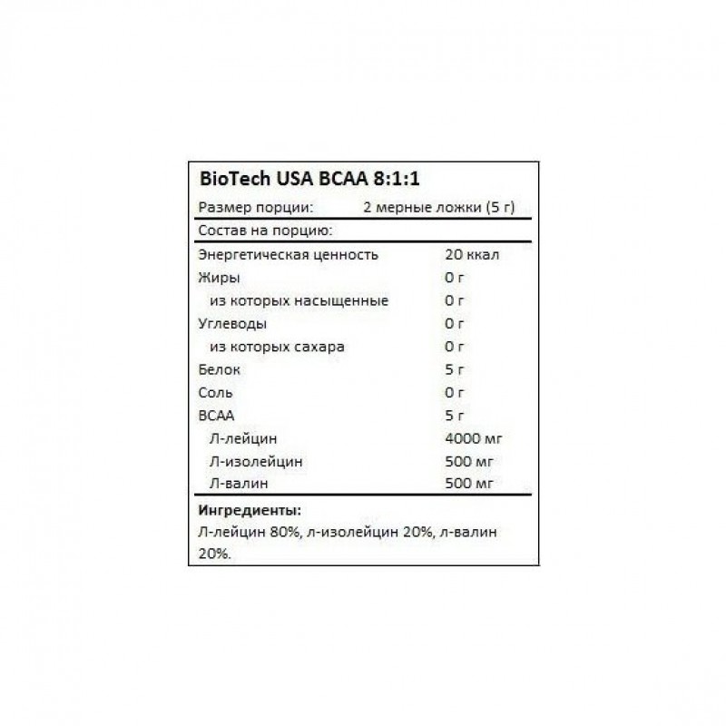 Аминокомплекс BCAA 8:1:1 от Biotech USA содержит повышенную концентрацию L-лейцина, аминокислоты, которая является наиболее важным компонентом для запуска анаболических реакций. Кроме того, лейцин способствует предотвращению активного разрушения мышц в период отдыха и восстановления. Добавки с повышенным содержанием лейцина также усиливают синтез коллагена – важного компонента для поддержки здоровья связок и хрящей.