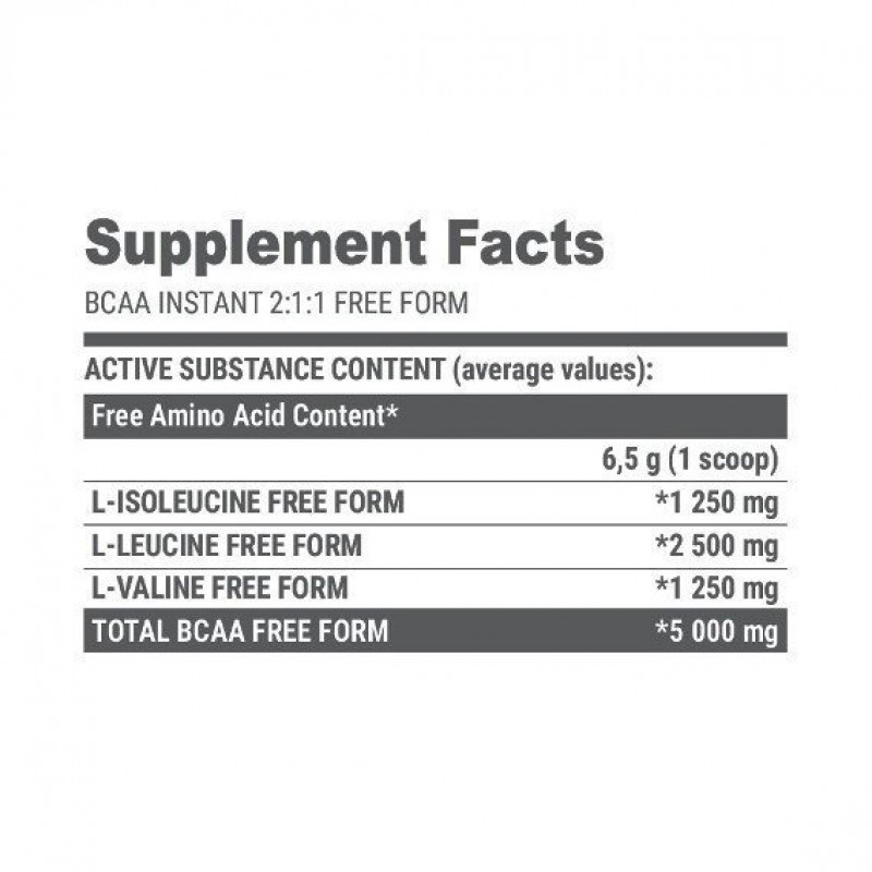 BCAA Instant 2:1:1 - это растворимые аминокислоты с разветвленной цепью в свободной форме, которые можно принимать в качестве вкусного напитка. BCAA Instant является революционным по своей форме - это растворимые, то есть растворимые свободные разветвленные аминокислоты (свободная форма), которые вы можете использовать во время тренировок в качестве вкусного напитка. Вы можете приготовить BCAA Instant в любое время суток, напиток готов за считанные секунды. BCAA Instant очень практичны и отвечают требованиям даже самых требовательных спортсменов.