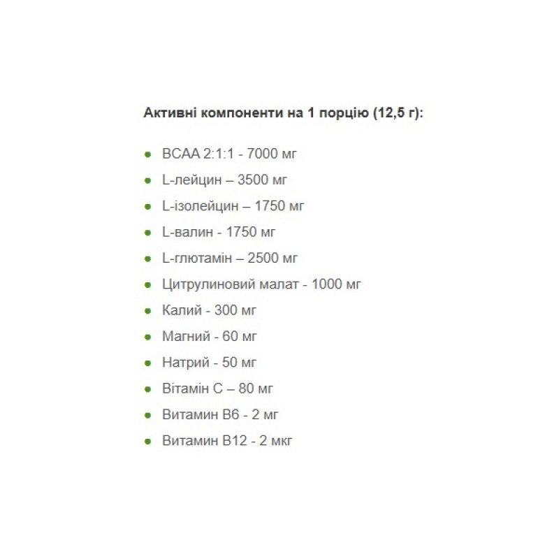 Смешайте 1 мерную ложку порошка (12,5 г) с 250 мл воды. Выпейте 1 порцию сразу после тренировки.