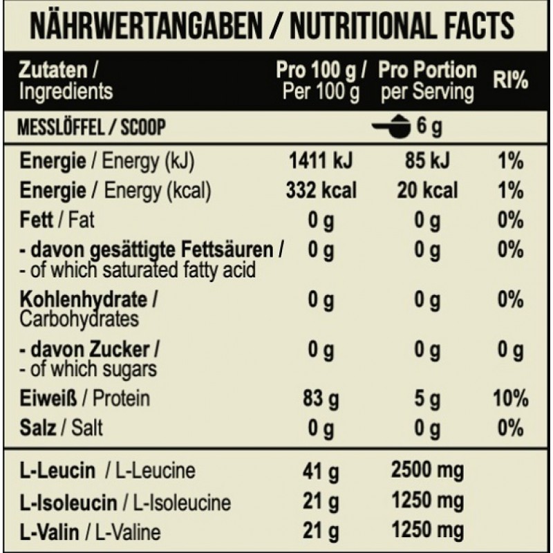 - В каждой порции содержится 5 грамм незаменимых инстанизированных аминокислот ВСАА в соотношении 2:1:1, на 6 грамм порцию.