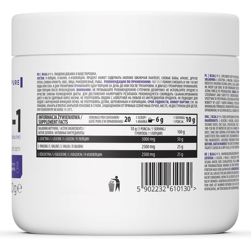 BCAA 2:1:1 OstroVit – это аминокислотный комплекс для восстановления между тренировками. В основу препарата положен лейцин, изолейцин и валин (в пропорции 2:1:1). Благодаря таким элементам, добавка помогает снизить боль в мышцах в период восстановления, а также ускорить рост мышечных волокон. BCAA улучшит самочувствие, зарядит энергией и укрепит иммунитет.