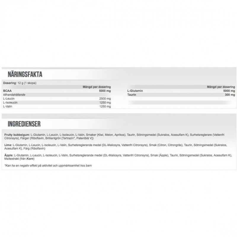 BCAA+GLUTAMINE XPRESS в соотношении 1:1 ВСАА и глютамина дополнительно обогащен таурином, который вместе с этими аминокислотами имеет способность уменьшить DOMS (замедленного наступление боли в мышцах).С разветвленной цепью аминокислот (лейцин, изолейцин и валин) приходится 35% незаменимых аминокислот и они имеют важное значение для хорошей конструкции мышечного белка. Они являются одними из девяти незаменимых аминокислот, которые наш организм не может синтезировать сам, и мы должны получить их ежедневно извне с помощью диеты или спортивных добавок.BCAA+GLUTAMINE XPRESS позволит раскрыться в каждой тренировке, чтобы мы могли получить результаты, к которым мы стремимся. Кроме того, благодаря фантастическому вкусу Fruity Bubblegum (Тутти-Фрутти), Лайм и Яблоко мы получим физическое восстановление наслаждаясь приятным вкусом.
