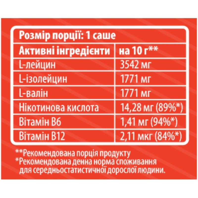 Аминокислоты - L - лейцин, L - изолейцин и L - валин являются важнейшими элементами для строительства новых белковых структур и основными компонентами, необходимыми для защиты мышечной ткани во время нагрузки, а соотношение 2:1:1 обеспечивает наиболее эффективное действие этих веществ.