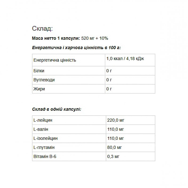 Аминокислотный комплекс состоит из аминокислот BCAA в соотношении 2:1:1 L-лейцина, L-валина, L-изолейцина, с добавлением L-глютамина и витамина B6.