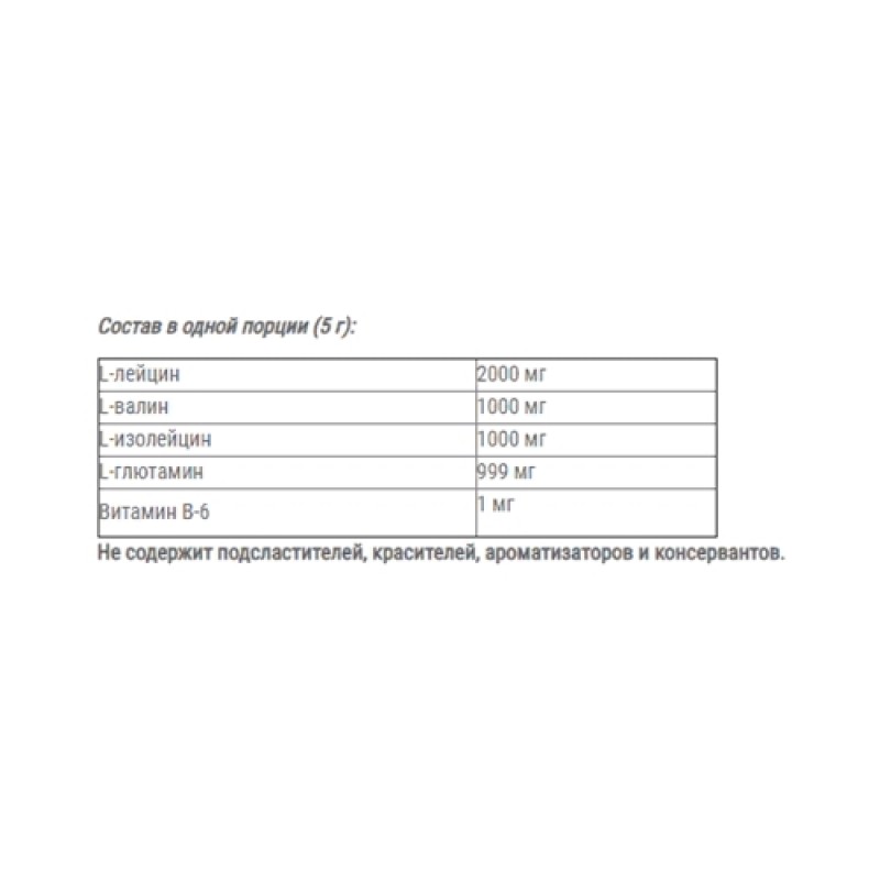 Аминокислотный комплекс состоит из аминокислот BCAA в соотношении 2:1:1 L-лейцина, L-валина, L-изолейцина, с добавлением L-глютамина и витамина B6, которые благоприятно воздействуют на организм.