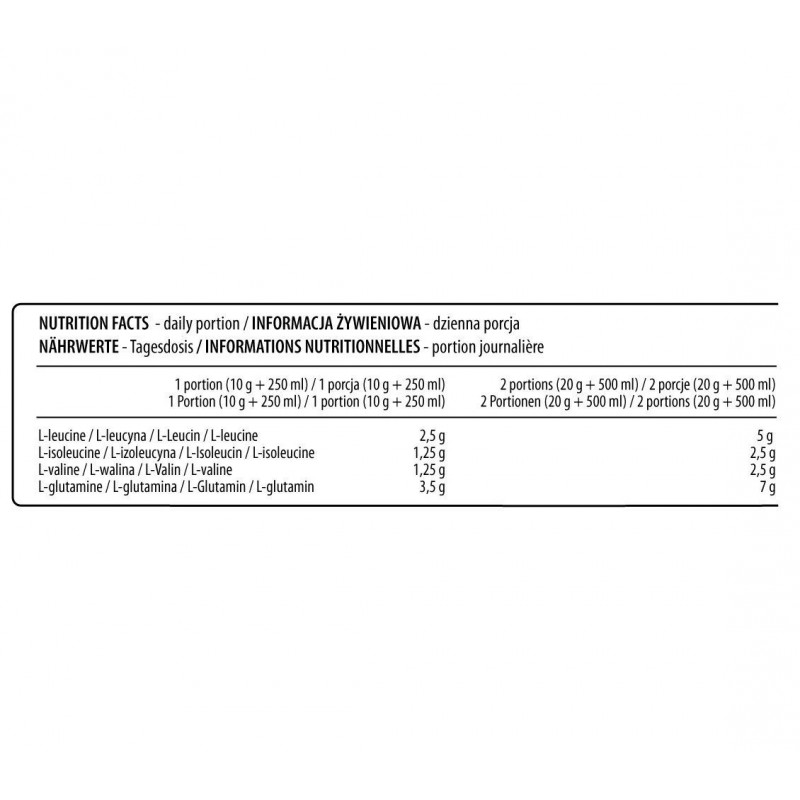 BCAA Xtra Instant – это комбинация аминокислот ВСАА и L-глутамин. В одной порции содержится 5 г аминокислот с разветвленными боковыми цепями (англ. branched-chain amino acids, BCAA) в соотношении 2:1:1. Аминокислоты BCAA составляют около 35% экзогенных аминокислот формирующих белок мышц, и их доля в употребленной пище должна составлять не менее 50%. Действие продукта усиливается наличием аминокислоты. L-глутамин- аминокислота, которая принимает участие в биосинтезе белка в организме, укрепляет иммунитет, оказывает антикатаболическое действие и ускоряет восстановление после тренировок. BCAA Xtra Instant от Activlab – это идеальное решение для тех, кто стремится увеличить мышечную массу без набора лишнего жира или уберечь свои мышцы от разрушения во время тяжелых физических нагрузок.
