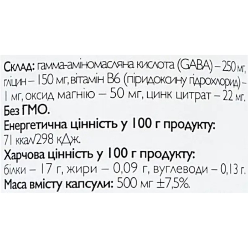 Комплекс с аминокислотами GABA+ Glycine All be Ukraine - продукт, способствующий нормализации работы нервной системы и укреплению иммунитета. Основными компонентами являются гамма-аминомасляный компонент (GABA) и глицин. Они помогают справиться с тревогой, стрессом, бессонницей и улучшить качество сна. Входящие в состав продукта витамины, магний и цинк усиливают действие основных компонентов и улучшают усвоение капсул организмом.