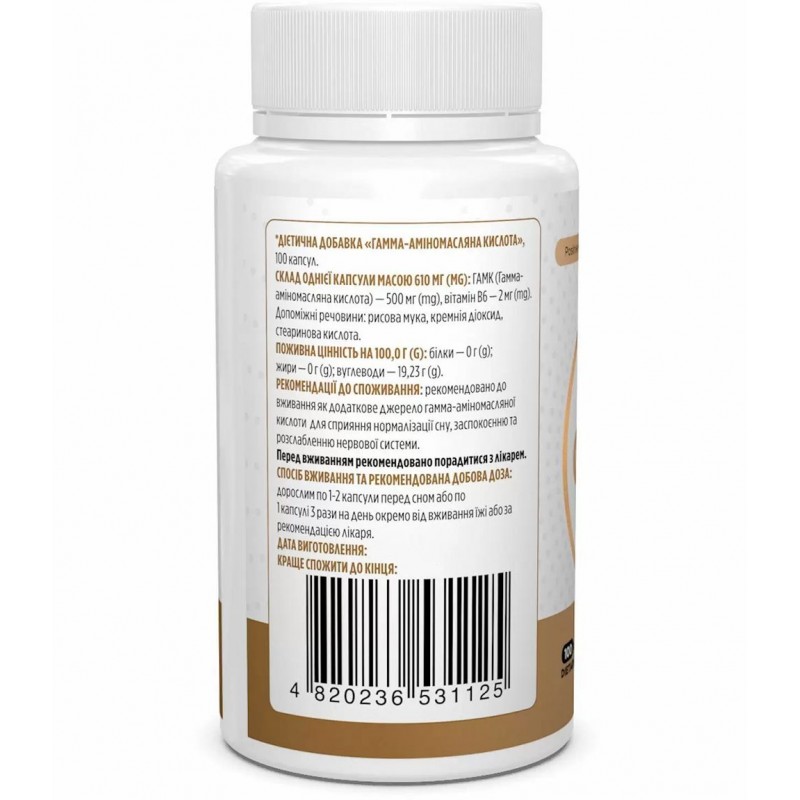 ГАМК (гамма-аминомасляная кислота), GABA, Biotus - это пищевая добавка от украинского производителя, которая содержит два ингредиента ГАМК и витамин В6, способствующих расслаблению ума и положительному настроению. Гамма-аминомасляная кислота – это аминокислота, которая естественным образом встречается в мозге человека, где она действует как тормозной нейромедиатор и является популярным ингредиентом, для снижения беспокойства и стресса. GABA является безопасным природным транквилизатором, медиатором центральной нервной системы, обладает успокаивающем и релаксирующем действием. Если мозг испытывает недостаток в ГАМК, могут возникать расстройства: тревожность, депрессия, судороги. Витамин В6 (пиридоксин) регулирует деятельность нервной системы, способствует повышению работоспособности мозга, улучшению памяти (участвует в процессе изготовления серотонина и норадреналина), повышению настроения и улучшения способности организма противостоять стрессовым ситуациям. При приёме перед тренировкой ГАМК создает анаболическое состояние, она способствует стимуляции синтеза гормона роста, который в свою очередь способствует росту мышц и утилизации жиров при физической активности. Прием добавки GABA от Biotus с витамином В6 способствует поддержке поддержке работы нейромедиаторов для регуляции сна, успокоения и расслабления нервной системы, в том числе и после нагрузок; способствует устранению головной боли и головокружения, сохранения умственной концентрации, улучшения памяти.