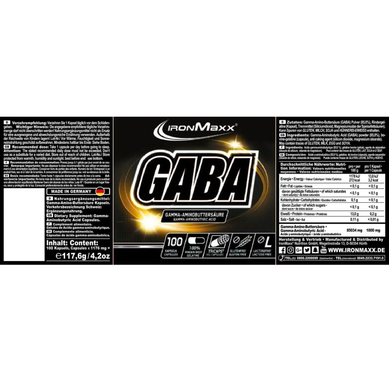 Компания Iron Maxx рада представить своим поклонникам суперэффективный комплекс Gaba. В его основе лежит гамма-аминомасляная кислота – вещество, которое является одним из важнейших нейротрансмиттеров в ЦНС.