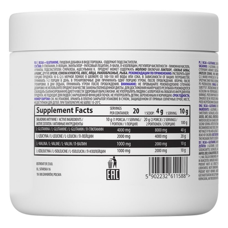 Способ применения BCAA + Glutamine Ostrovit и дозировка: в дни тренировок принимать две порции, сразу после пробуждения и после тренировки. В дни без тренировок принимать одну порцию сразу после пробуждения. Рекомендуется растворять в воде или любимом соке. Принимайте сразу после приготовления.