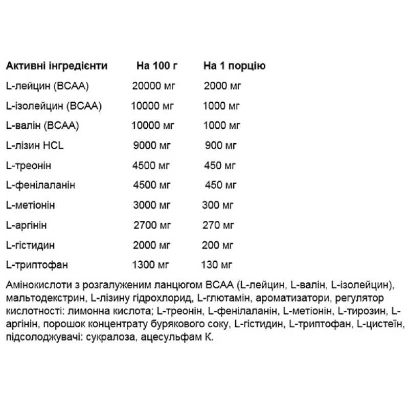 Источник незаменимых аминокислот – порция пищевой добавки обеспечивает организм 2000 мг L-лейцина, 1000 мг L-изолейцина, 1 000 мг L-валина, 900 мг L-лизина, 450 мг L-треонина, а также 450 мг L-фенилаланина, 300 мг L-триптофана.