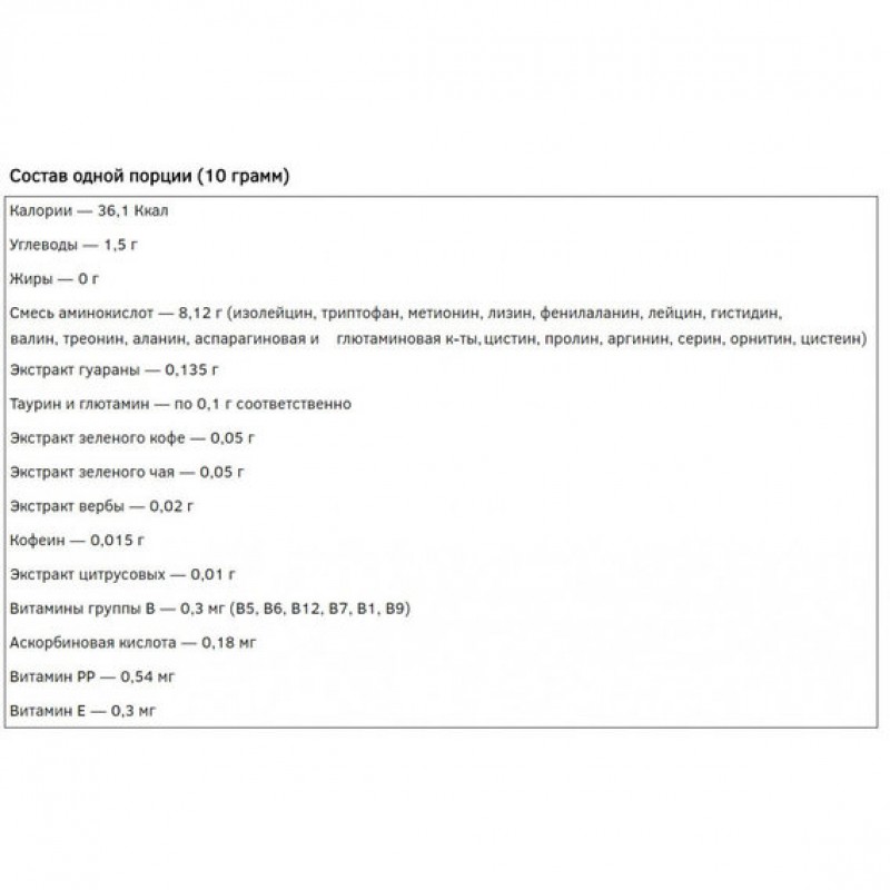 Amino Energy System – новый аминокислотный и энергетический комплекс от Power Pro. В его состав входят легкоусвояемые аминокислоты и стимуляторы. Комплекс специально разработан для повышения выносливости во время физической нагрузки с использованием уникальной транспортной матрицы для восстановления. Amino Energy System стимулирует процессы обмена веществ в организме, запускает синтез белка, содействуя росту сухой мышечной массы. Смесь способствует быстрому усвоению углеводов, благодаря чему мышцы не поглощают сами себя для получения энергии. Также, Amino Energy имеет легкий анаболический эффект и благоприятно воздействует на концентрацию и внимательность. В сочетании с витаминами компании DSM Nutritional Products обновление организма будет происходить на уровне внутренних органов, укрепляя иммунную систему. Вам не потребуется дополнительный прием витаминов, так как аминокомплекс улучшит работу желудочно-кишечного тракта, оптимизирует работу сердца, печени и почек, ускорит восстановление соединительных тканей организма. В состав Amino Energy кроме 20 необходимых аминокислот входят: гуарана, таурин, экстракты зеленого кофе и зеленого чая. Благодаря их действию вы забудете чувство усталости, активизируете силу, повысите свою работоспособность и повысите энергетический обмен. Энергетические добавки улучшат выносливость и восстановление в 2 раза, и вы сможете тренироваться намного интенсивней и плодотворней. Аминокомплекс обладает приятным ароматом фруктового лимонада, который подарит вам свежесть и утолит жажду. Amino Energy System – это уникальный рост силы и энергии.