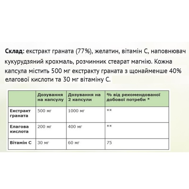 Стандартизация продукта по элаговой кислоте придает препарату Экстракт Граната Granatapfel 500 мг сильных антиоксидативных свойств.