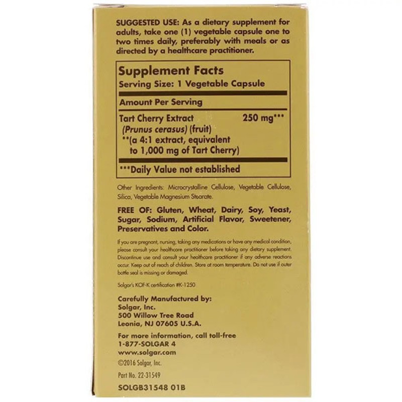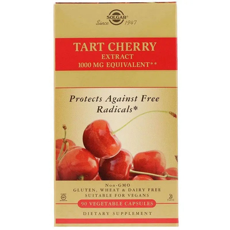 Экстракт дикой вишни, Tart Cherry Extract, Solgar – очень полезная биодобавка терпкой вишни без калорий и сахара, содержащая большое количество витаминов (витамина С, витаминов группы В), аминокислот, микроэлементов (железа, йода, меди), органических кислот, полифенольных антиоксидов. , которые борются со свободными радикалами, вызывающими окислительное повреждение клеток в нашем организме.