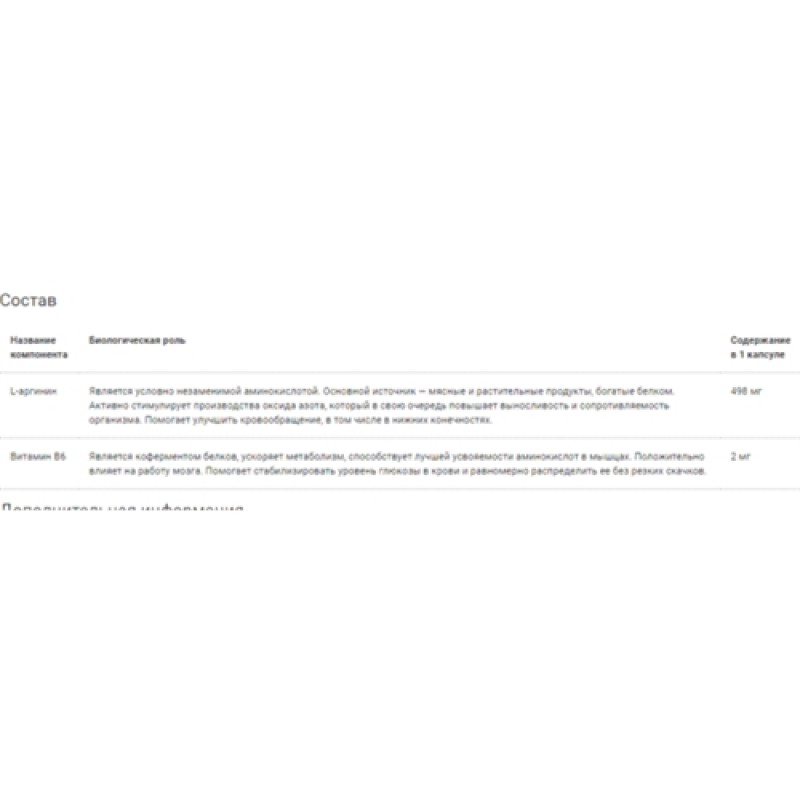 Действие L-аргинина дополнено витамином В6. Он активно стимулирует обмен веществ, и таким образом дополняет действие аминокислоты. При его участии легче проходят процессы снижения веса и так называемой “сушки”. В комплексе действующие вещества обеспечивают отличную выносливость, оптимальный уровень энергии и высокую эффективность тренировок любого типа.
