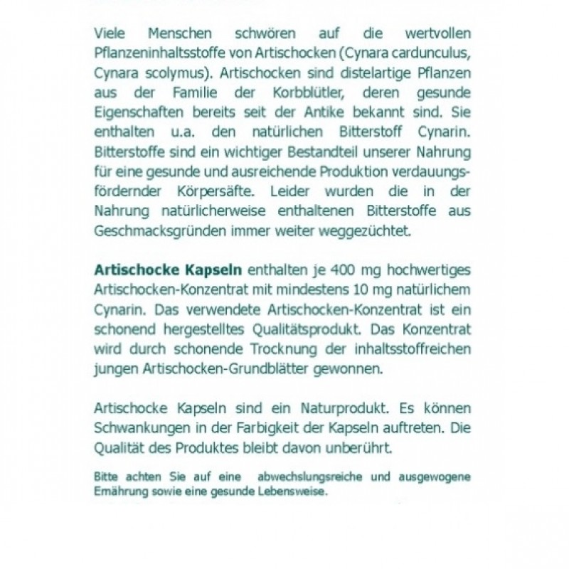 Каждая капсула артишока содержит 400 мг высококачественного концентрата артишока и не менее 10 мг натурального цинарина. Используемый концентрат артишока - это тщательно продуманный качественный продукт. Концентрат получают путем осторожной сушки богатых ингредиентами базовых листьев молодого артишока.