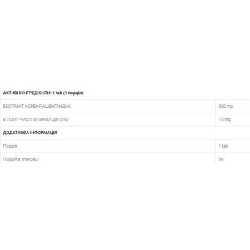 Экстракт корня Withania somnifera (Ashwagandha) - 300 мг в т.ч. витанолиды (5%) - 15 мг