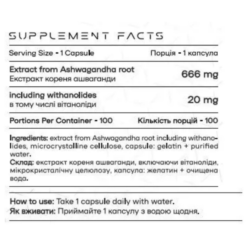 Способ применения: Рекомендуется принимать по одной капсуле ASHWAGANDHA на день во время приема еды, запивая достаточным количеством воды. Это обеспечит максимальное усвоение ценных веществ ашваганды.