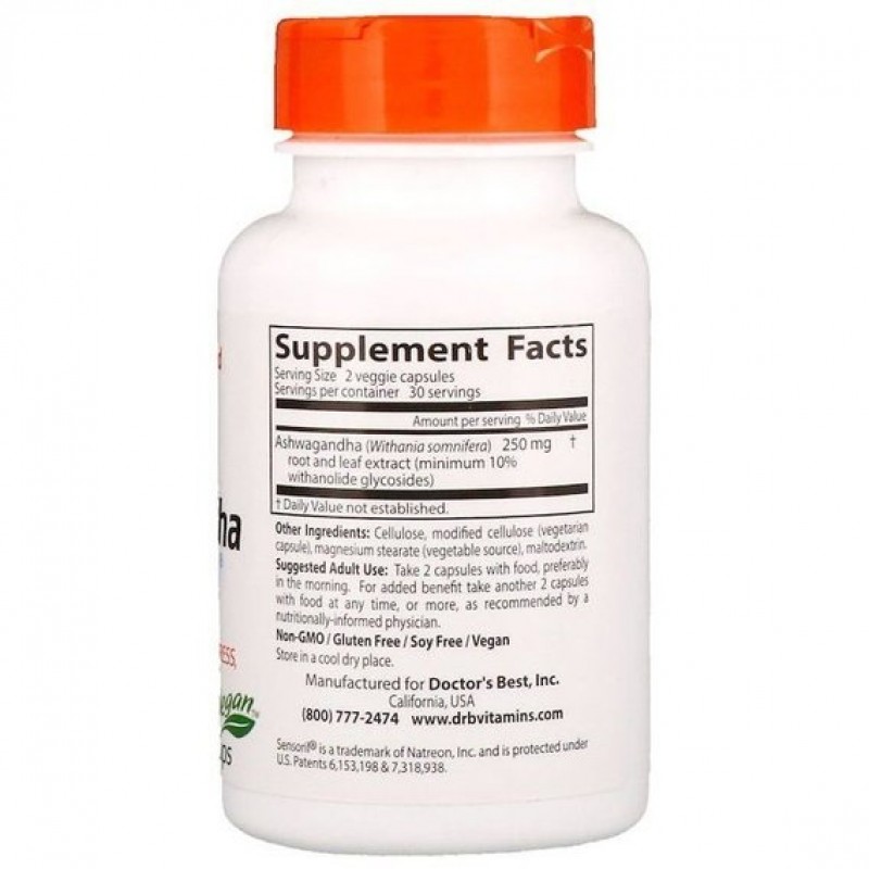 Ашвагханда Doctor's Best с Сенсорилом является научно обоснованным препаратом известного аюрведического суперплана Withania Somnifera. Клинические исследования показали, что Ашвагхандха помогает поддерживать управление стрессом и умственную концентрацию. Также было показано, что он помогает поддерживать энергию и бдительность.