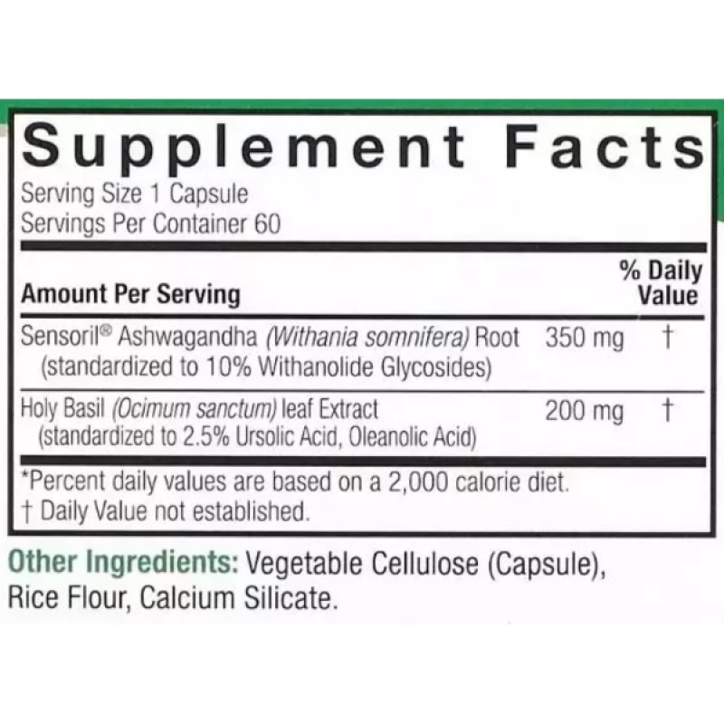 Ашваганда в первую очередь имеет седативные свойства. Корень ашваганды снижает уровень гормона кортизола, который ответственен за стресс и панику. Как результат, общее самочувствие после регулярного приема ашваганды становится значительно лучше, повышается продуктивность, мозговая деятельность, начинают проходить симптомы болезней, вызванных стрессом, становятся реже головные боли. После приема этого растения становится заметным укрепление иммунитета, сопротивляемость организма вирусам, инфекциям и бактериям. Было отмечено, что проходят воспалительные процессы. Базилик священный также известен своей способностью облегчать эмоциональный, физический, экологический стресс и усиливает действие Ашваганды.