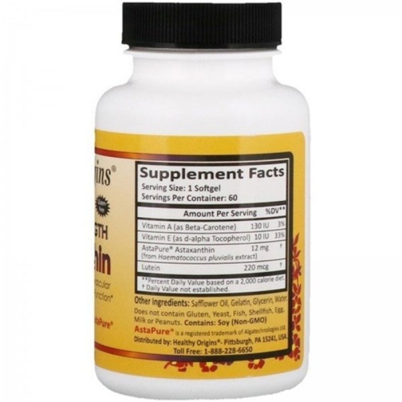 Натуральный астаксантин от Healthy Origins содержит натуральный астаксантин AstaPure и является каротиноидом, который врабатывается из микроводорослей Haematococcus pluvialis. Исследования показали, что потребление натурального астаксантина способствует здоровью суставов, глаз, сердечно-сосудистой и иммунной систем.