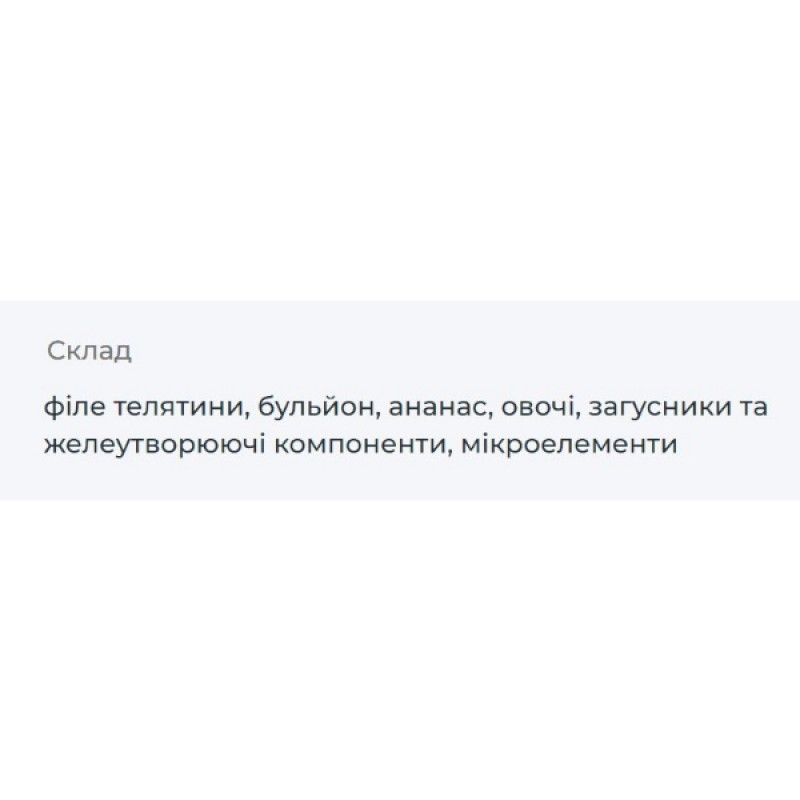 Полнорационный беззерновой влажный корм из кусочков филе телятины с ананасом для собак. Гипоаллергенный. Монопротеиновый.