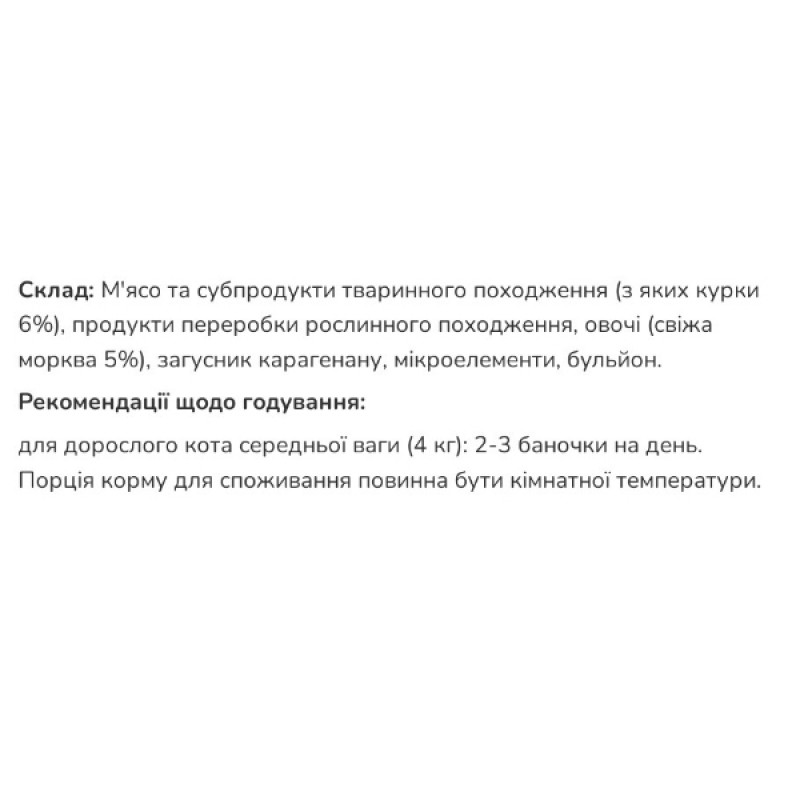 Продукция включает в себя натуральное мясо, покрывающий потребность обогащения организма белком, железом и витаминами. Также каждая порция корма содержит в себе цельные кусочки овощей, которые обогатят организм питательными веществами.