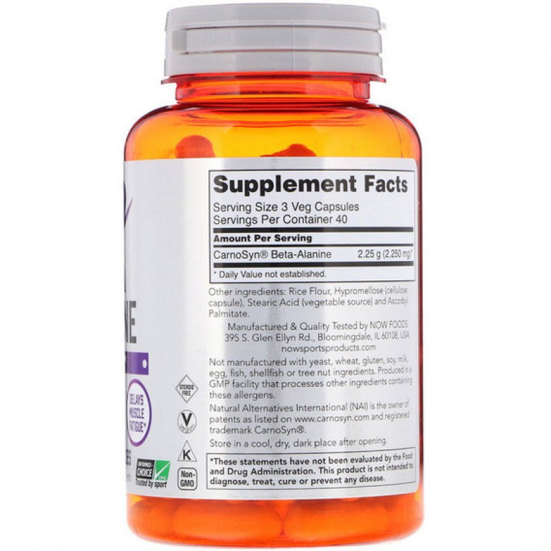 Бета-аланин — это незаменимая аминокислота, которая используется мышечными клетками для синтеза карнозина. Карнозин — это дипептид (бета-аланин плюс гистидин), который работает в качестве буфера для ионов водорода (кислоты), вырабатываемых во время физических нагрузок, помогая тем самым поддерживать оптимальный уровень рН в мышцах. В данном препарате из спортивной серии NOW используется CarnoSyn, запатентованная форма бета-аланина, которая была клинически протестирована и продемонстрировала увеличение содержания карнозина в мышцах. В результате мышцы могут работать интенсивнее и дольше во время интенсивных упражнений.