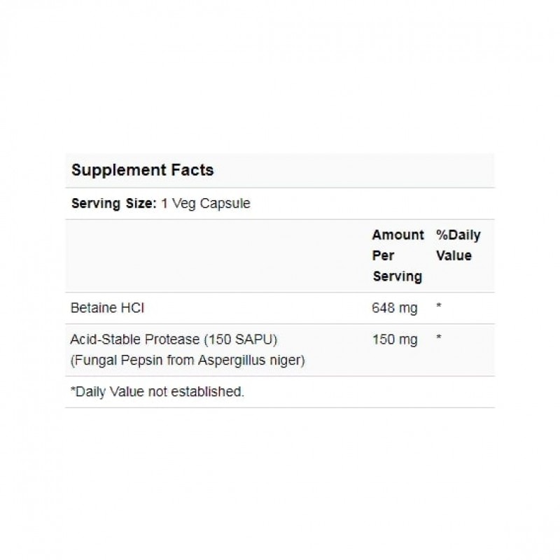 Гидрохлорид бетаина от NOW обеспечивает нормальный процесс переваривания пищи в желудке. Хлористоводородная кислота (HCl) вырабатывается в желудке естественным образом. Она способствует перевариванию белков, активируя действие пепсина, обеспечивает сохранение баланса кишечной микрофлоры и стимулирует выброс ферментов кишечника. Пепсин — это протеаза, которая производится в желудке и частично перерабатывает белок из пищи. Объем вырабатываемой HCl с возрастом уменьшается, поэтому восполнение этого вещества и пепсина способствует поддержанию нормального процесса пищеварения. Этот продукт включает в себя вегетарианскую и устойчивую к кислоте протеазу, активность которой эквивалентна пепсину животного происхождения.