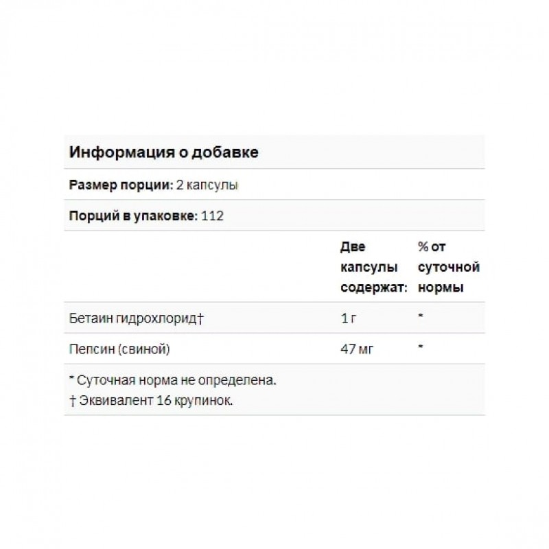 - Бетаин гидрохлорид, полученный из нерастительного источника. Этот продукт не разбавлен лактозой.