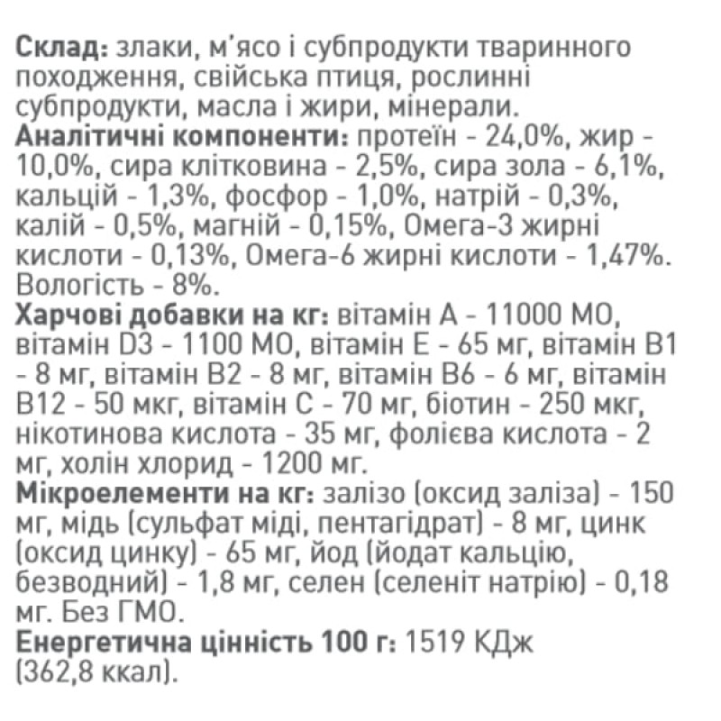 Полноценный сбалансированный корм для взрослых собак, изготовлен в Германии и отвечает международным стандартам из контроля за качеством и безопасностью пищевых продуктов - International Featured Standards IFS Food, HACCP, ISO 50001: 2011, не содержит химических красителей, ароматизаторов, усилителей вкуса, синтетических антиоксидантов, протеина сои, ГМО. Во время производства корма используется только высококачественное сырье известного происхождения и применяются самые современные способы экструзии с высокой степенью расщепления сырья, существенно повышает усвояемость готового продукта.